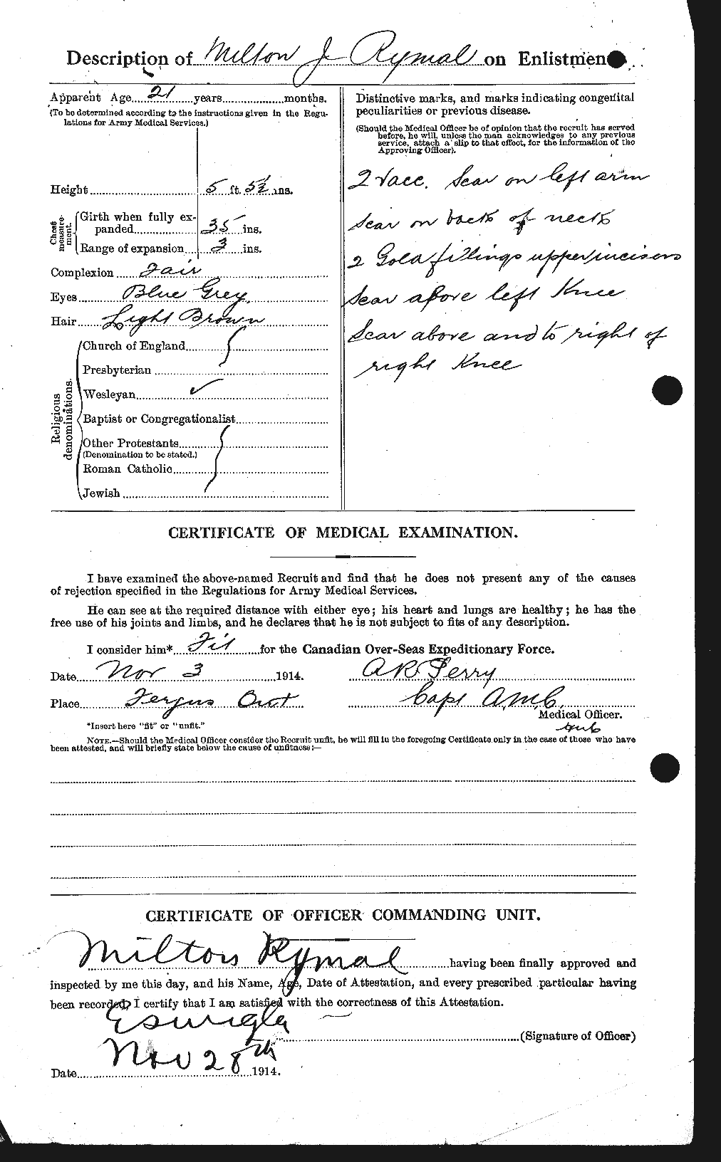 Trade listed as Farmer. DOB 3-5-93, born Chicago. NOK Mrs. Prudence Rymal, mother. Enlisted 18th Fergus 3-11-14 (age 21 years), lists 1 year service in 30th Wellington Regiment. On Nominal Roll 30th Wellington Regiment Camp London June 1913, H Coy. 5 foot 5 1/2 inches. Blue-grey eyes, light brown hair. Wesleyan. On 18th Battalion Sailing List SS Grampian, Halifax N.S. 18-4-15. To France with 18th Battalion 14-9-15. Returned to Canada aboard SS Olympic 17-1-19. Demobilized Toronto 11-2-19. Ontario Marriage Registry (027177) marriage 17-11-19 to Margaret Annie Dungey at Palmerston. Veterans Death Card: died 5-9-47, no further information given. Photos ph5248 & ph53408 courtesy Wellington County Museum & Archives. OCFA: buried Waterdown Municipal Union Cemetery, Flamborough East, Wentworth. File: RG 150, Accession 1992-93/166, Box 8589 - 17, courtesy Library & Archives Canada. |